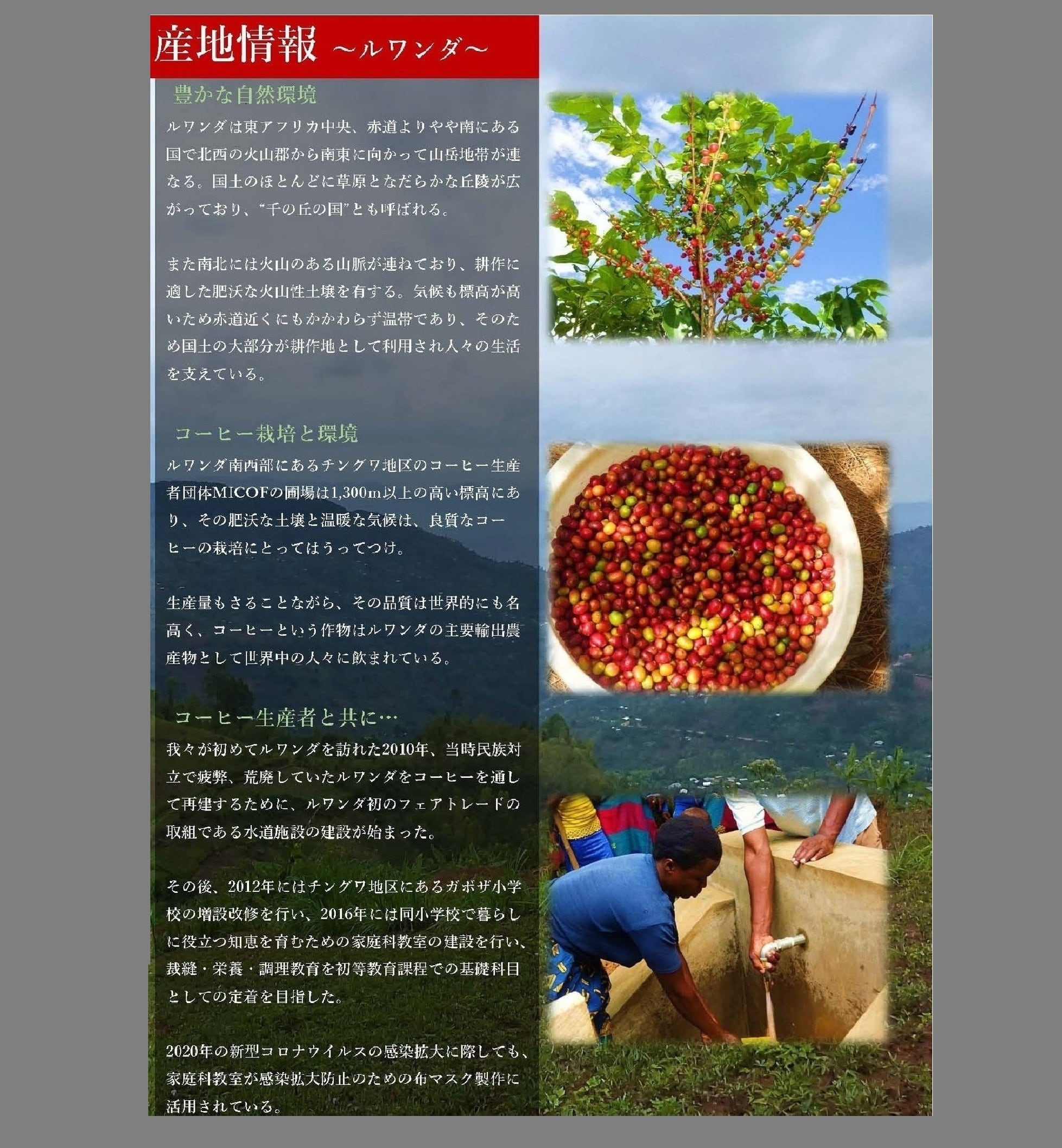 この豆は、ルワンダ共和国南西部チングワ地区の標高1300m以上にある圃場(コーヒー生産団体MICOF)長期にわたり無農薬・無化学肥料の持続可能な循環型農業により育て、手摘みして生産されています。その豆をフェアトレードしたものを使用しています。まろやかで深みのある味わいのコーヒーです。焙煎の度合いで、違ったおいしさを味わえるのも魅力ですが、焙煎者が特においしいと感じる中やや深煎りでお届けします。